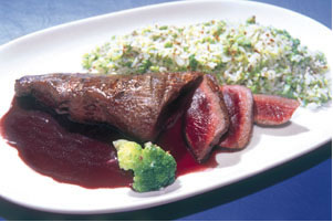 Tempere a alcatra apenas massageando a carne com sal grosso em todos os lados. Depois leve à grelha previamente aquecida e com fogo forte durante 10 minutos de cada lado a uma distância de 25cm. Vire apenas uma vez. Para preparar o molho, coloque primeiro a manteiga para aquecer e refogue nela a cebola picadinha. Acrescente a farinha de trigo e mexa com uma colher de pau. A seguir, as ervas, o suco de uva e o vinho. Mexa até engrossar. Deixe ferver até reduzir para 40% do volume inicial, o que leva cerca de 20 minutos. Retire a alcatra da grelha, fatie, arrume numa travessa e regue generosamente com o molho. A carne vai estar bem assada por fora, mas seu miolo ainda estará vermelho bem vivo, quase sangrando, acentuado pelo molho de vinho tinto. Apesar da aparência, para alguns não muito convidativa, esse é o seu ponto ideal de cozimento. Sirva com arroz com brócolis.