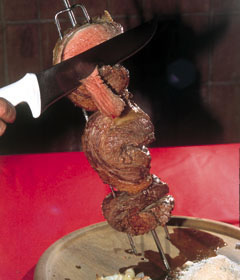 Corte a maçã do peito em medalhões com aproximadamente 4cm de espessura, eliminando os excessos de gordura, deixando apenas a camada de gordura externa de cada um. Coloque os medalhões em forma de “U” em espeto único, sendo 3 pedaços por espeto. Corte 1 dos limões ao meio e tempere com ele a carne já espetada, em ambos os lados. Espalhe sal grosso com a palma da mão sobre os dois lados da carne. Leve à churrasqueira e coloque o espeto a 50cm do braseiro bem vivo. Após sair a salmoura do lado de cima da carne (+ ou – 10 minutos), vire-a e bata com a lâmina da faca até cair todo o sal grosso. Espere sair novamente salmoura (outros 10 minutos) do outro lado da carne (depois de virada), e pode começar a servir fatiada bem fininho, cortando no sentido do espeto tirando gordura e carne em cada fatia cortada. Tempere novamente com suco de limão e sal grosso e leve o espeto de volta à churrasqueira. E assim será até que toda a carne seja servida: fatiar, retemperar e voltar ao braseiro. Ao mesmo tempo, antes mesmo de colocar a carne na churrasqueira, espete as cebolas, com a casca, e coloque no canto da grelha a uma distância de 50cm do braseiro forte. Vá virando sempre (se tiver uma churrasqueira com espetos giratórios, melhor) para que assem por igual e deixe até soltarem do espeto. Retire-as, descasque com cuidado para não se queimar, fatie em gomos e tempere com molho vinagrete. Numa frigideira, derreta a margarina, misture a farinha e o cheiro verde, e deixe dourar levemente. Se achar necessário, tempere com uma pitada de sal refinado. É um excelente prato para tira gosto. O sabor da maçã do peito é indiscutível.